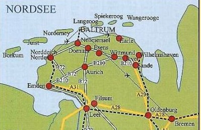 Autobahn Hansalinie (A1), Abfahrt Alhorner Heide auf die A29 Oldenburg-Wilhelmshaven, Abfahrt B 210 über Jever-Wittmund-Esens nach Dornum-Dornumersiel-Neßmersiel